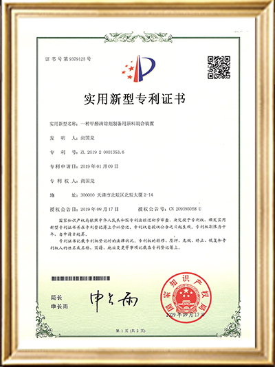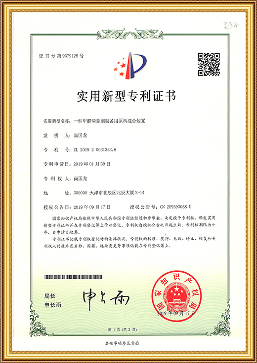 • 實用新型專利證書(一種甲醛清除劑的原料混合