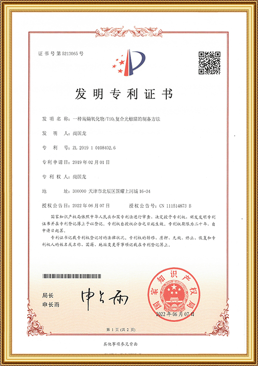 • 發明專利證書證書(一種高稿氧化物/Ti02復合光觸